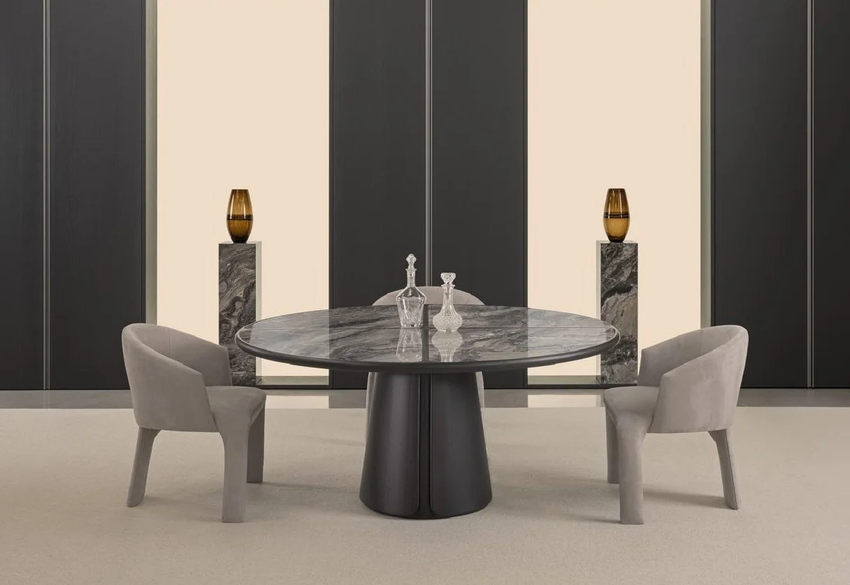 The Fuga table takes its name from the vertical cut on the wooden base that divides the central base into two elements. This gives it a three - dimensionality, which is supported by an internal metal structure. In the wooden top instead we always find the same decoration, which divides the top into four equal wedges, beveled and soft, made of marble or stone. This creates a natural and authentic harmony.