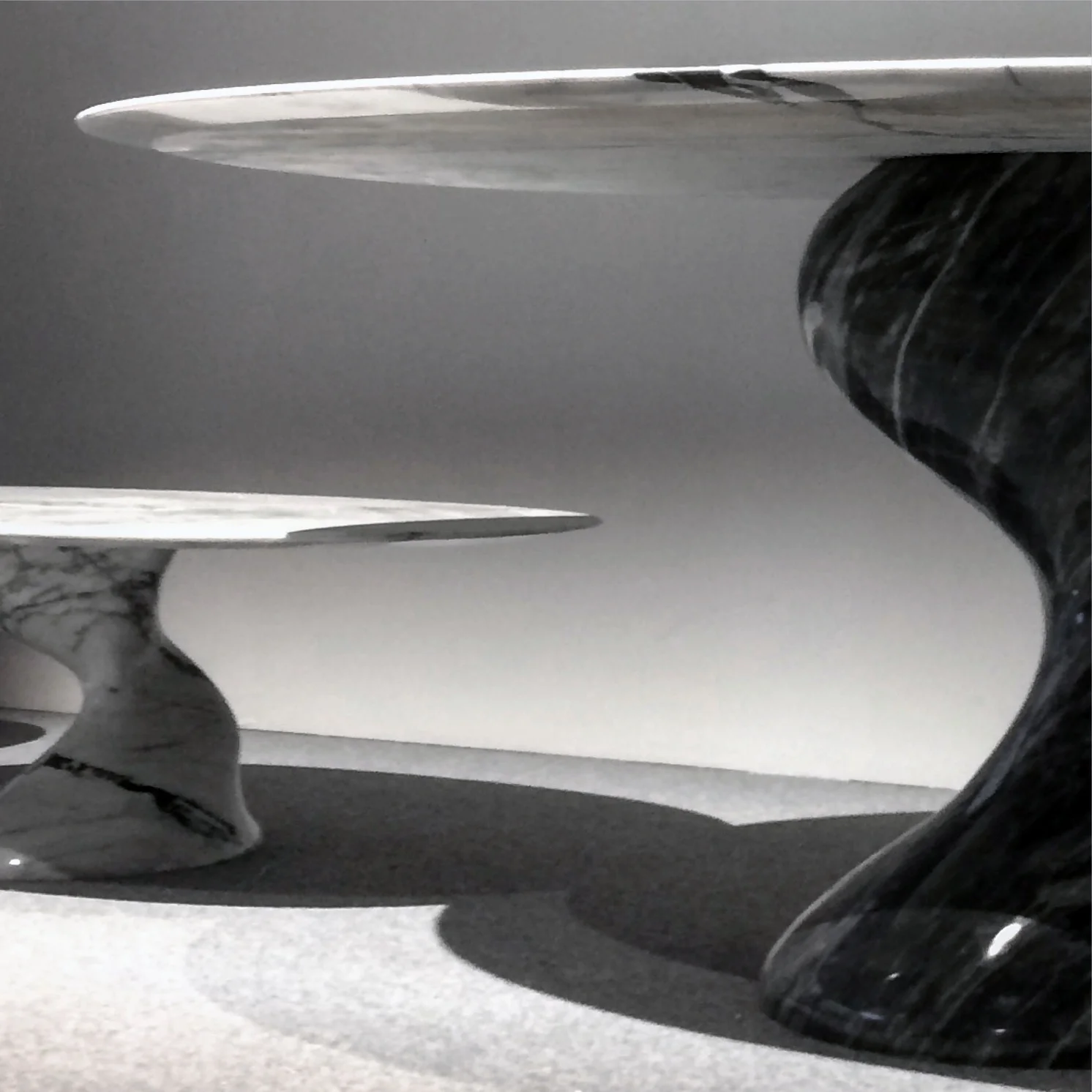 Elic is a natural shaped Table; it looks similar to a helix or a cyclone, and has natural traits, that are natural and futuristic at the same time. The marble appearance is hard and cold, but also extremely smooth and sensual, thanks to its high density characteristics. The surface looks similar to a cloth, like a carpet, like an element that floats and rides in the wind the entire table simulates a continuous movement, emphasized by the ebauty of the GDA Carrara Marble, whose natural decor consists of the typical dark vein of Carrara Marble.